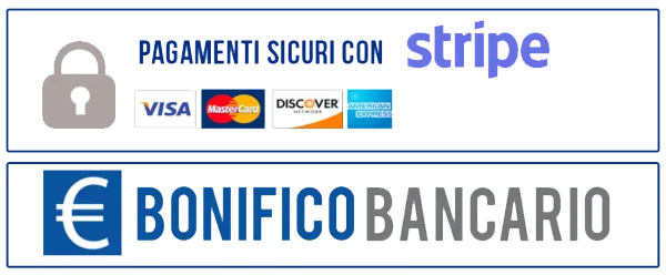 Puoi pagare con Carta e tutte le modalità di pagamento elencate in fase di acquisto. Puoi pagare anche con bonifico bancario facendo richiesta chiamando il num. +39 333 95 68 502 per ricevere le coordinate per il bonifico.